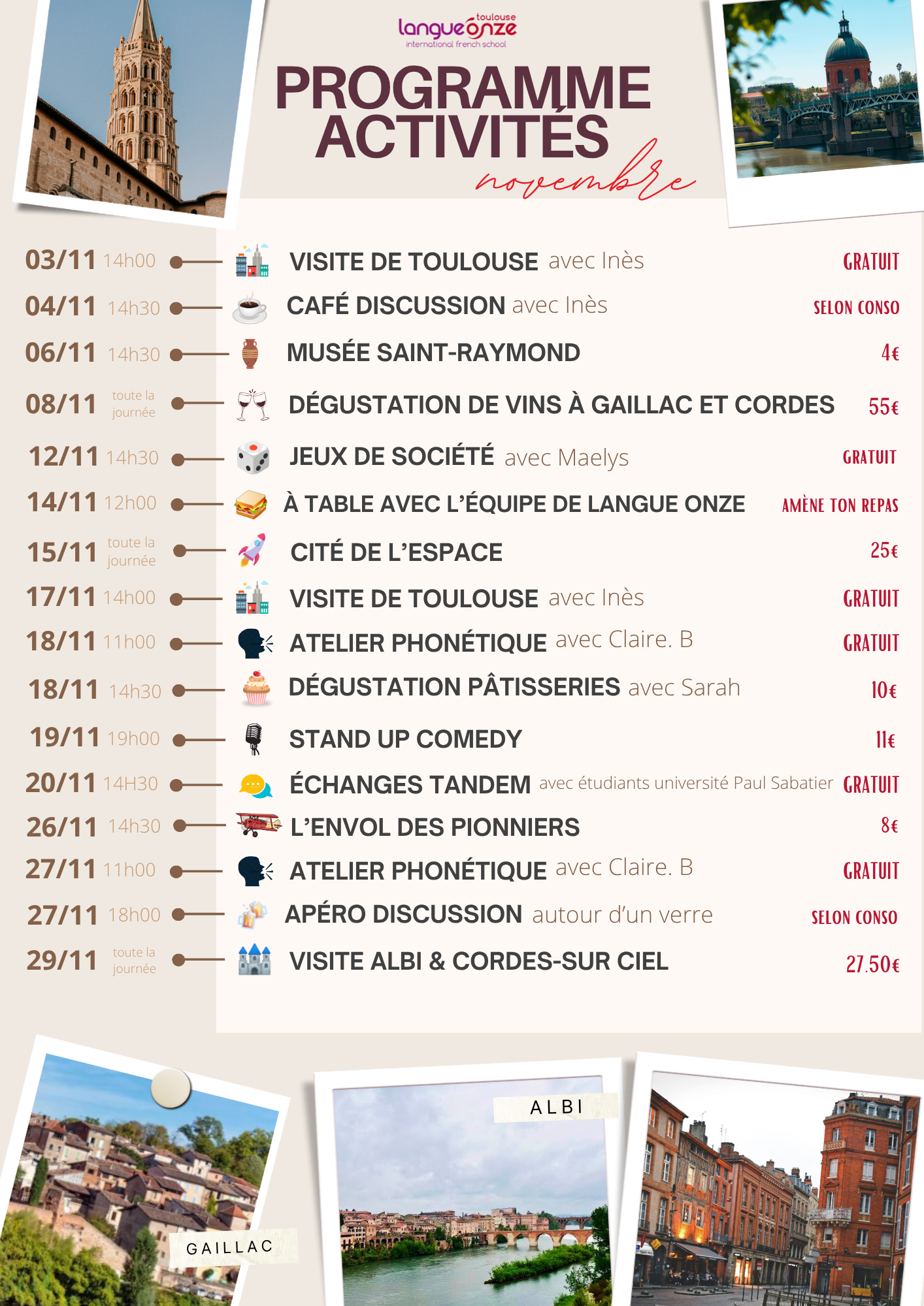 Toulouse is a creative city with art, celebration, and scientific excellence. No matter what your interests or preferences are, there is sure to be an event, a museum, a production, or a performance for you. Langue Onze organizes and offers a diverse selection of activities every month, including outings to allow everyone to get the most out of their experience.